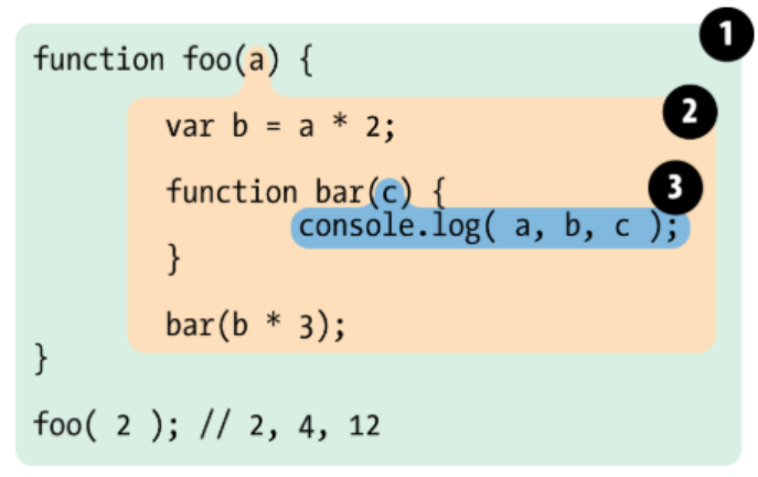 - 泡泡2是作用域foo,有标识符a,bar,b;